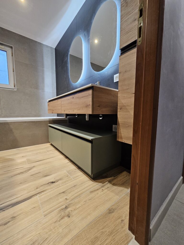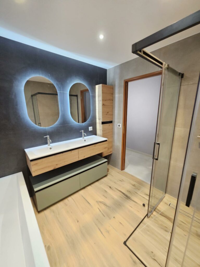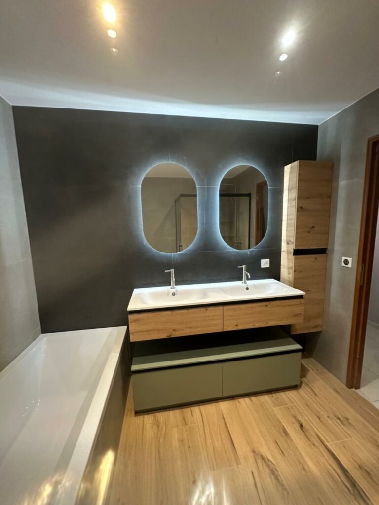 Le meuble double vasque devient un élément central du projet, permettant une utilisation simultanée et limitant les conflits d’usage.