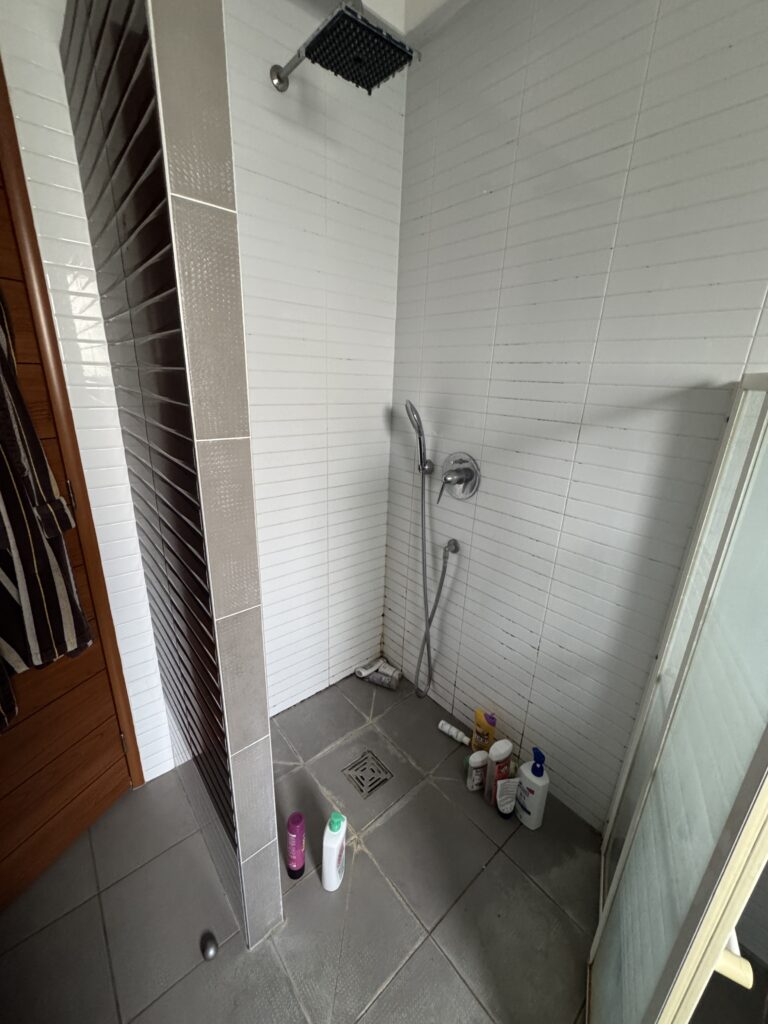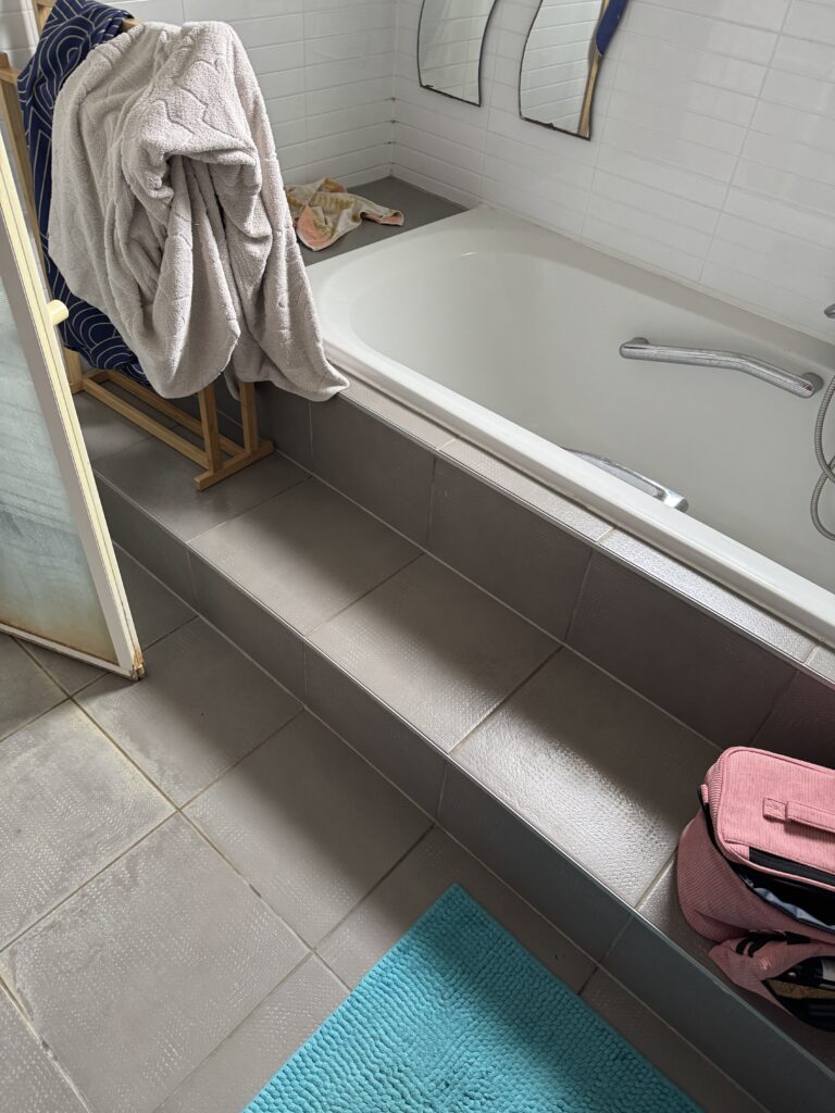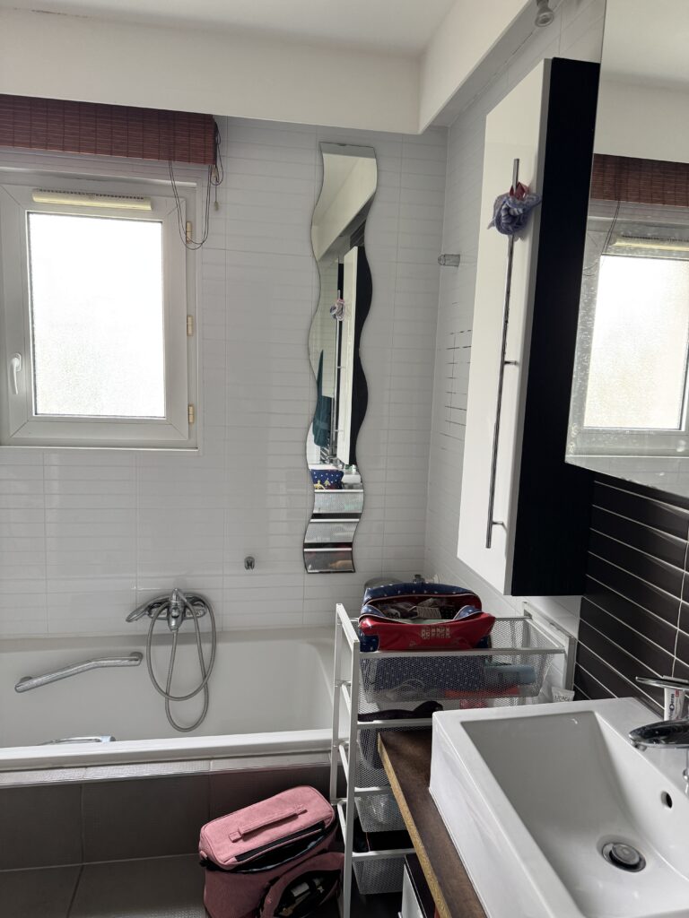 Mais au-delà de l’aspect visuel, c’est surtout l’implantation qui posait problème. La baignoire encastrée avec une marche monopolisait l’espace, et aucun aménagement n’avait été pensé pour une utilisation simultanée.